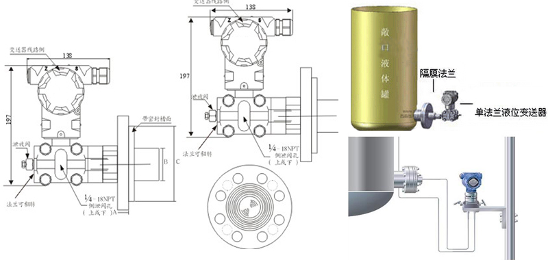 單法蘭液位變送器可以直接安裝在敞口的管道或容器上,由于隔離膜片直接與液體介質相接觸,無須將正壓側用導壓管引出,因此可以測量高溫、高粘度、易結晶、易沉淀和強腐蝕等介質的液位、壓力和密度,然后將其轉換成4~20mA.DC信號輸出。