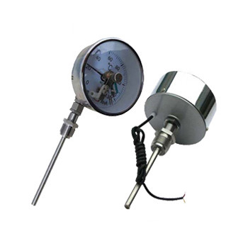 電接點雙金屬溫度計是基于繞制成環性彎曲狀的雙金屬片組成。一端受熱膨脹時,帶動指針旋轉,工作儀表便顯示出熱點勢所應的溫度值。