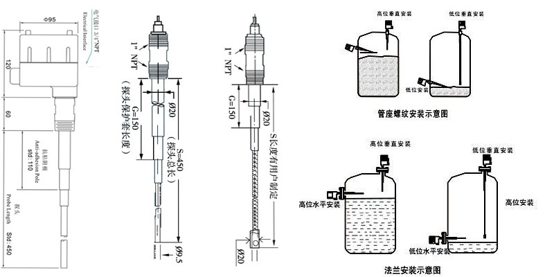 四、射頻導納物位計外形尺寸圖及安裝示意圖: