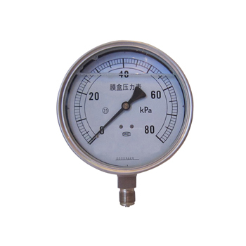 膜盒耐震壓力表由測(cè)量系統(tǒng)(包括接頭膜盒等)、傳動(dòng)機(jī)構(gòu)、指示裝置和外殼組成。當(dāng)被測(cè)介質(zhì)的壓力作用于膜盒時(shí),其自由端產(chǎn)生相應(yīng)彈性變形一位移,經(jīng)撥桿帶動(dòng)傳動(dòng)機(jī)構(gòu)放大,由指示裝置將被測(cè)壓力在儀表盤上指示出來,且表內(nèi)充油,達(dá)到耐震的效果。